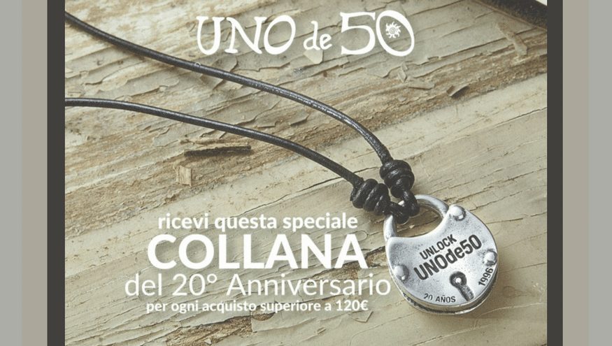 Uno de 50 – il marchio spagnolo di gioielli artigianali in Peltro – compie 20 anni ed ha deciso di celebrarli regalandoti l’esclusiva collana “Unlock Uno de 50” in edizione limitata, ma solo fino al 21/12…Affrettati!