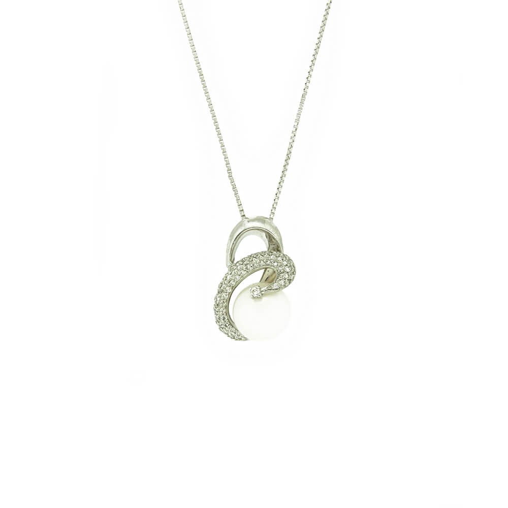 Collana in oro bianco con ciondolo in oro bianco, diamanti e perla. Collana con pendente in oro bianco (grammi totali: 6.60 g). Il ciondolo di questa collana ha come punto focale la perla da 10 mm impreziosita da un elegante castone in oro bianco ricoperto di diamanti e terminante con un diamante di caratura maggiore (0.35 ct) subito sopra la perla. Gioiello importante per signore raffinate ed eleganti, da abbinare agli orecchini e all’anello della stessa linea.